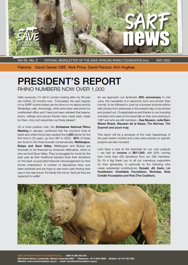 Newsletters The Save African Rhino Foundation publishes newsletters annually. Newsletter May 2024 DOWNLOAD Newsletter April 2023 DOWNLOAD Newsletter May 2022 DOWNLOAD . Newsletter April 2021Download Newsletter April 2020Download Newsletter May 2019Download Newsletter April 2018Download Newsletter April 2017Download Newsletter May 2017Download Newsletter June 2016Download Newsletter May 2015Download Newsletter May 2014Download Newsletter Dec 2013Download Newsletter May 2013Download Newsletter Dec 2012Download Newsletter June 2012Download Newsletter Dec 2011Download Newsletter April 2011Download Older Newsletters May-2010Oct-2009Apr-2009Nov-2008Mar-2008July-2007May-2007Sep-2006May-2006Sep-2005April-2005May-2004Apr-2004Dec-2003May-2003Apr-2002Mar-2002Jun-2001Jun-2000Apr-2000Nov-1999Nov-1999Sep-1999May-1999May-1998Apr-1997Dec-1996Jun-1996Jan-1996Oct-1995Jun-1995May-1995Sep-1994Apr-1994Sep-1993Jun-1993Feb-1993Sep-1992May-1992Feb-1992Sep-1991May-1991Dec-1990Aug-1990Apr-1990Dec-1989Nov-1989Apr-1989Feb-1989